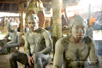 Initiation marks a boy’s passage into manhood and his formal connection to the world of spirits and ancestors. During the ceremony, initiates’ faces are painted with intricate protective designs, and the ritual ideally takes place during adolescence, though it is often delayed by schooling or work outside the village.