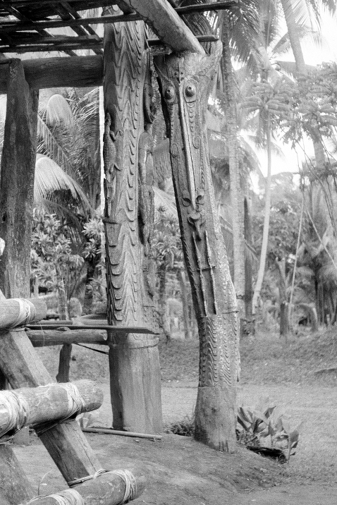 The men’s house (tambaran or haus tambaran) embodies Iatmul spirituality and social order. In the past, the house posts were beautifully carved to depict parts of clan mythology. These carvings constituted the foundation of not only the house, but also the entire society. The building on the rectangular dance ground represented the first grass island that floated down the Sepik River, as described in a creation myth. At the same time, it represented the first crocodile: the primeval ancestor who emerged from the depths of the flood. Today, the ground level of the men's house is used by initiated men in everyday life. It contains slit gongs, fireplaces, sitting platforms, and ritual objects of minor importance. The upper floor is mainly used for rituals and is where the long flutes and other sacred paraphernalia are kept. Iatmul culture is rich in myths that explain how everything came into being.
