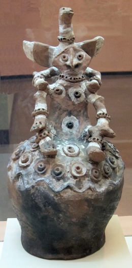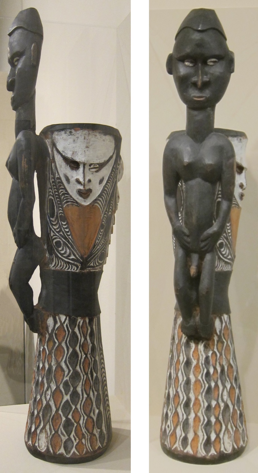 Finial ornament with human figure surmounted by a totemic bird from the Chambri Lakes area, Aibom Village, Aibom People, red clay with white pigment