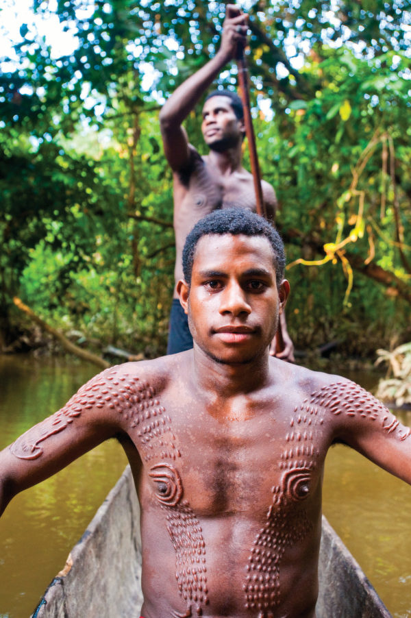 As they emerge from the Spirit House to have their backs cut, they are greeted by friends and family chanting encouragement. Pain is seen as the crucible through which a boy is reborn as a man. After the cutting, the initiates are taken back inside to rest. Fires are lit to keep the air hot and dry. A special mixture of river mud and oil from the Kaumever tree is applied with a feather to encourage controlled infection — the swelling and raised keloids that give the scars their distinctive crocodile texture. The wounds are carefully tended over several days as the initiates recover, enduring the heat and pain in silence. The process is dangerous; infections sometimes prove fatal. But the scars that remain are considered a mark of spiritual rebirth and ancestral power.