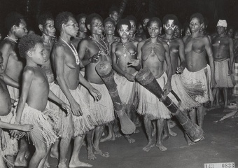 Ceremonies were important. The most significant public events were large pig feasts and men’s cult feasts, often held together. These gatherings took place in special feast compounds containing a large ceremonial house and an open plaza with sleeping quarters for hundreds of guests—sometimes up to 700. Preparation could take six months or more, and feasts were hosted by a clan segment roughly once every decade. While their public purpose was to redistribute pork, they also served to honor the dead and reinforced the prosperity and prestige of the host group. Men’s cult feasts followed similar patterns but were additionally linked to male initiation rites.