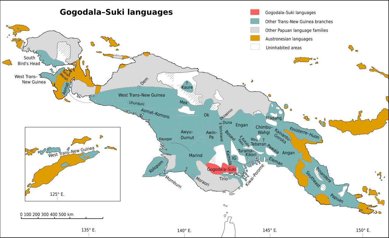 Gogodala Language is Non-Austronesian, belonging to a small family whose only other member is Ari-Waruna, which Gogodala people understand but do not speak. Linguistic ties link them with the Suki people within the Trans–New Guinea phylum. Today, most Gogodala also speak Tok Pisin, and many are fluent in English.