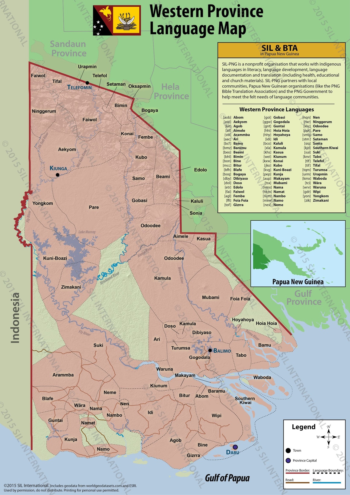 Western Province lies along Papua New Guinea’s southwestern coast, bordering Indonesia’s Highland Papua and South Papua provinces. Its capital is Daru. Tabubil is the largest town. Other important centers include Kiunga, Ningerum, Olsobip, and Balimo. Covering 99,300 square kilometers (33,840 square miles), Western Province is Papua New Guinea’s largest province. The Fly River and its major tributaries—the Strickland and Ok Tedi—cross the region, and Lake Murray, the country’s largest lake, is also located here. In the 2011 census the province had 201,351 people in 31,322 households, with an average household size of 6.4. Population distribution was: Middle Fly (79,349), North Fly (62,850), and South Fly (59,152). [Source: Wikipedia]