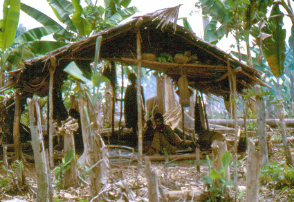 From the air, Gebusi settlements appear as small clearings scattered across dense rainforest. In 1980–82, seventeen main residential sites existed, averaging about 26 people each, with populations ranging from 6 to 54. Although dispersed, smaller settlements gravitated socially toward larger ones, where initiations, major feasts, and dances were held. Larger communities featured a communal longhouse—over 20 meters long and roofed with sago leaves—with a central ground-level area for cooking and socializing and elevated, sex-segregated sleeping areas at the rear. These longhouses were complemented by small garden houses and temporary shelters used during extended gardening or foraging trips. Daily life was highly mobile: on any given night, about 45 percent of residents slept away from the village. [Source: Bruce Knauft, “Encyclopedia of World Cultures, Volume 2: Oceania,” edited by Terence E. Hays, 1996]