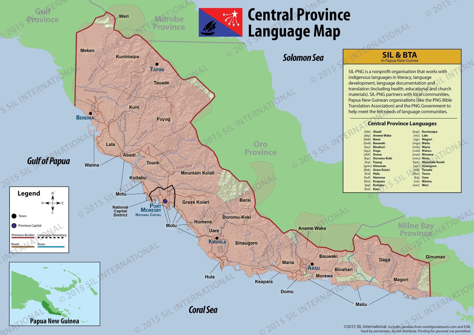 Central Province stretches along Papua New Guinea’s southern coast. It covers 29,998 square kilometers (11,582 square miles) and had 237,016 people in the 2010 census. Its administrative seat is in Konedobu, within the National Capital District, though plans announced in 2007 proposed relocating the capital to Bautama—a project that has seen little progress. While Tok Pisin is Papua New Guinea’s dominant lingua franca, Hiri Motu remains widely used in parts of the southern mainland coast around Central Province. [Source: Wikipedia]