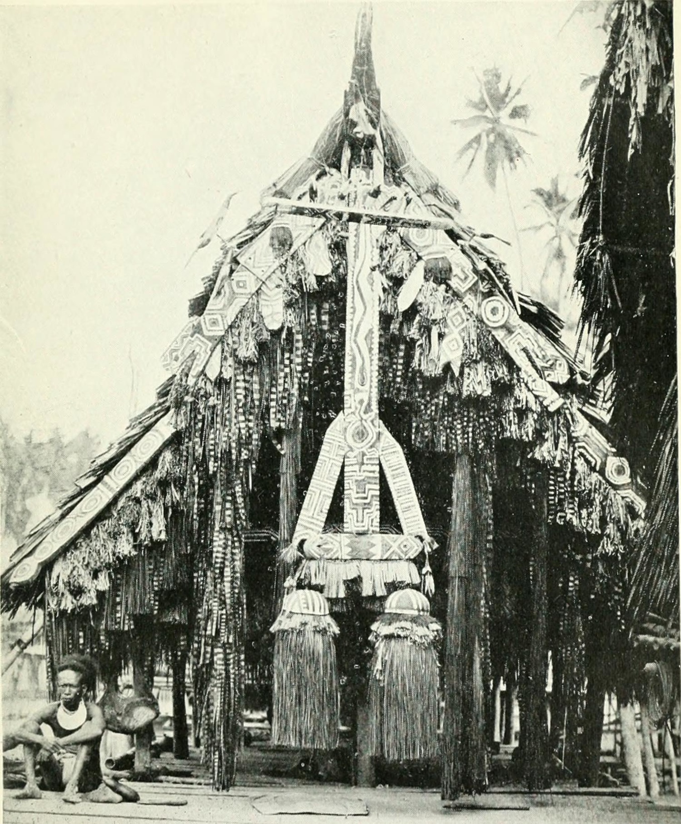 Mailu Villages consist of two facing rows of stilted family houses, divided by a broad central road. Before European contact, men’s houses (dubu) stood in the middle of this road, positioned perpendicular to the dwellings. Houses were two-story structures: the upper floor was a single, windowless room enclosed by heavy thatch and reached by a ladder and trapdoor, while the lower floor remained open, with pandanus or woven reed mats set up as temporary screens when needed. Ridgepoles were elaborately carved, and pig jaws and fish tails were hung on the front supports as decoration. Domestic space was not formally divided into men’s and women’s areas, though men typically gathered toward the roadside end and women toward the back. Fenced gardens were located behind the houses. [Source: Nancy E. Gratton, “Encyclopedia of World Cultures, Volume 2: Oceania,” edited by Terence E. Hays, 1996 ~]