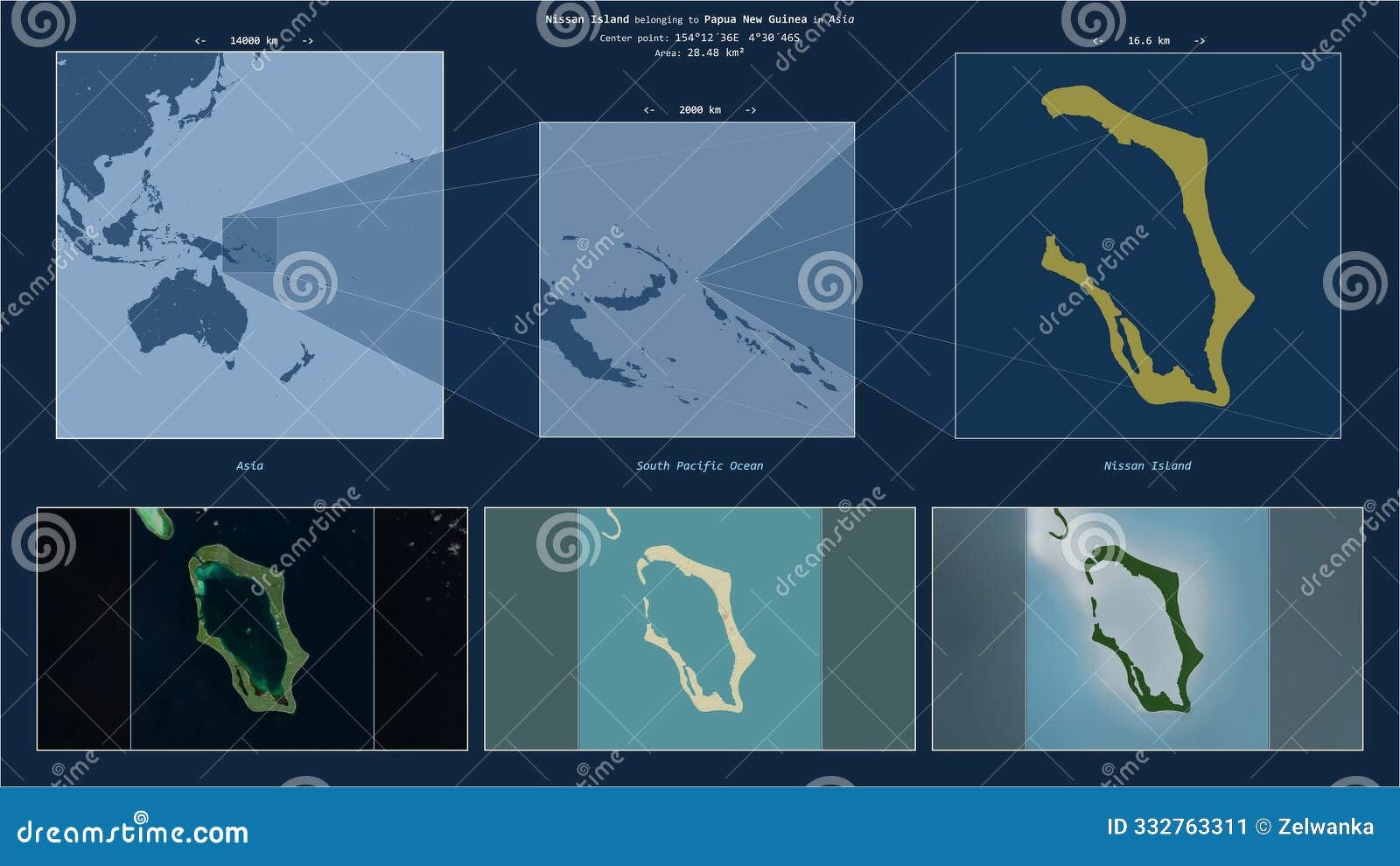 Nissan atoll is elliptical-shaped — about 15 kilometers long and up to 7 kilometers wide — with a narrow land rim (never more than 2 kilometers across) surrounding a large lagoon, broken by three passages on the northwest side. Pinipir (Pinipel) lies 2.5 kilometers farther northwest and consists of a long, narrow island less than 10 kilometers in length plus a small uninhabited islet.